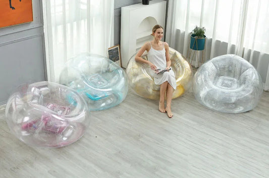 Transparent Glitter Blow-Up Chair + Matching Leg RestMake your space pop with personality! Whether you're lounging in your bedroom, chilling at a pool party, or upgrading your dorm room vibes, our Glitter Inflatable Chair Set brings comfort AND shine.