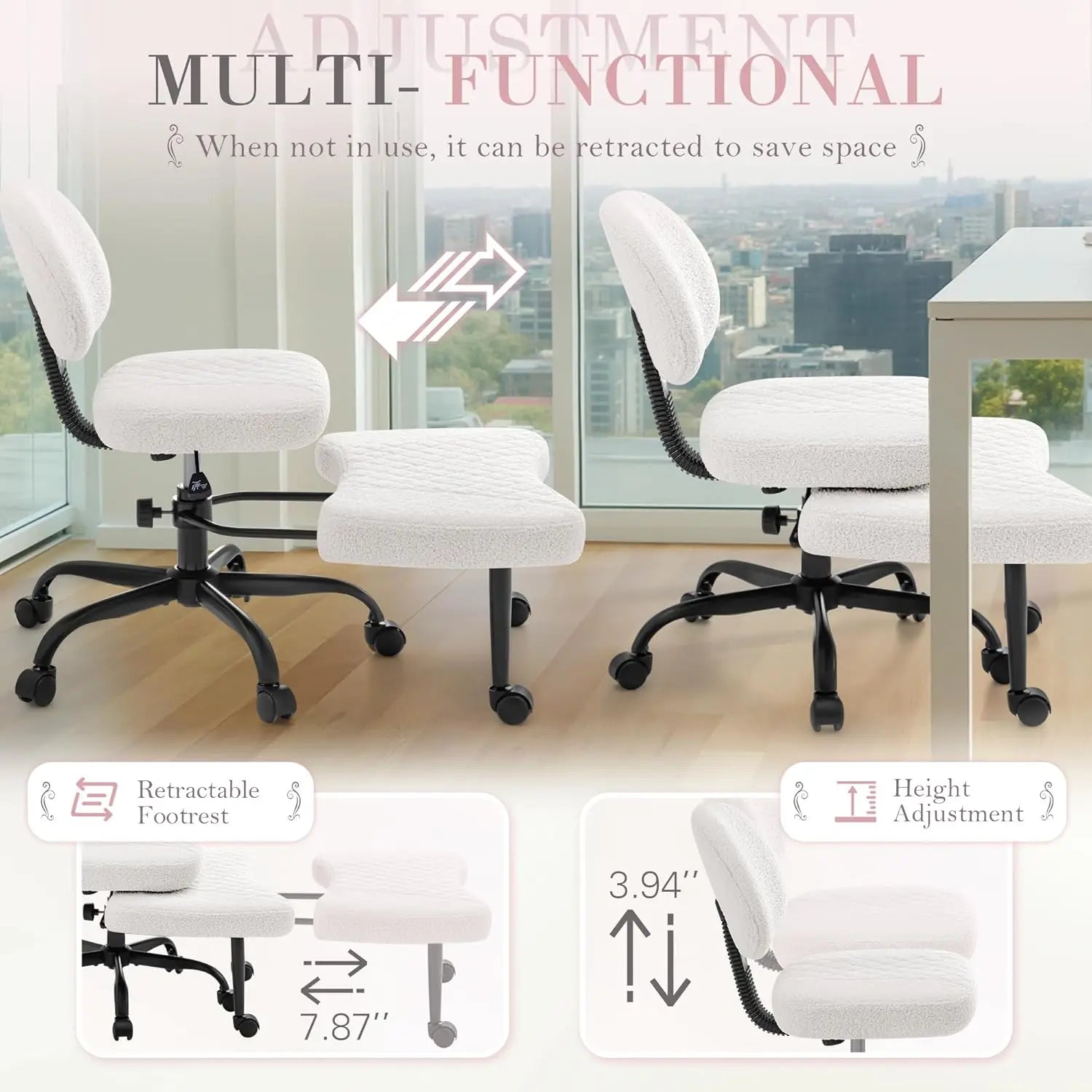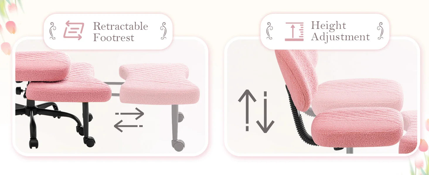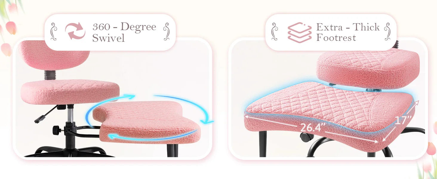 Both the seat and footrest rotate 360°, with height adjustment from 0" to 4.7"—perfect for finding your ideal position and enhancing focus or creativity -